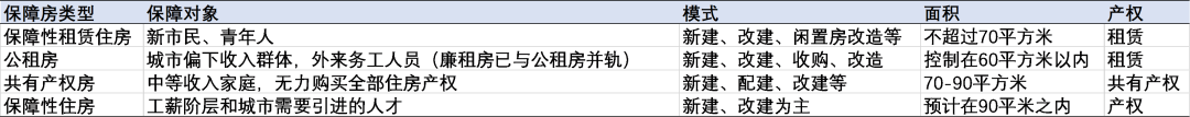 而未來(lái),保障性住房和保障性租賃住房,分別從實(shí)際產(chǎn)權(quán)房和租賃模式,與商品房一同構(gòu)成我們的多元化住房供給體系。14號(hào)文的推出,也確實(shí)重新構(gòu)建了我國(guó)的多元化、多層次保障住房體系,具體詳見下表。